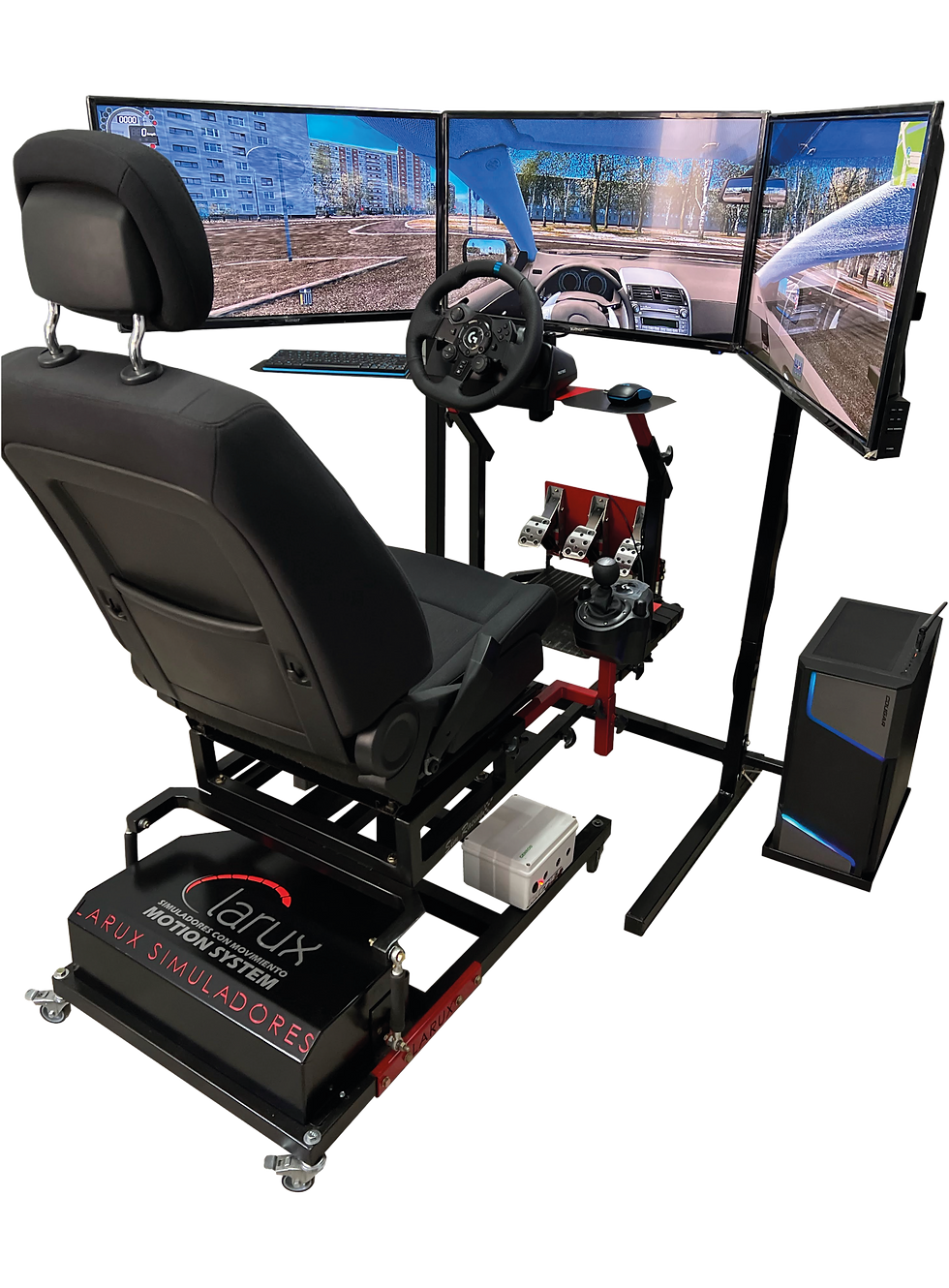 Simulador de 3 ejes de movimiento con cockpit de diseño exclusivo para cada cliente y posibilidad de adaptar 3 pantallas a la plataforma